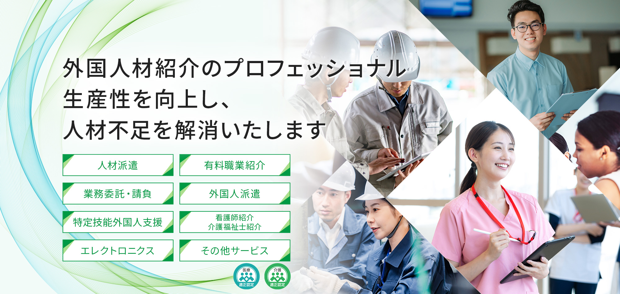 当社では、製造業・医療・介護分野を中心に、多彩な業種に対応できる体制を整えており、業界ごとの特性やニーズを的確に把握し、それぞれに合った最適な人材サービスをご提案しております。その積み重ねにより、これまで数多くの企業様から厚い信頼をいただき、長期に渡るパートナーとして選ばれてまいりました。これからも柔軟な対応力ときめ細やかなサポートを活かし、幅広い分野でさらなる価値を生み出し、企業様と人材のよりよい未来に向けて力を尽くしてまいります。